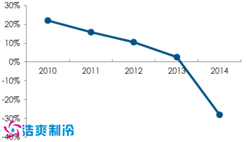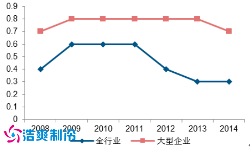 2010-2014 年,企業總資產周轉總體下滑。同時,過高的總資產導致行業總體 ROE 偏低,雖然國家出臺多項政策支持、政府補貼和出售資產等營業外收入使得國有大型倉儲企業 ROE 改善,但是企業經營仍然處于困境,2014年大型倉儲的主營營業收入處于-28%的增長率。