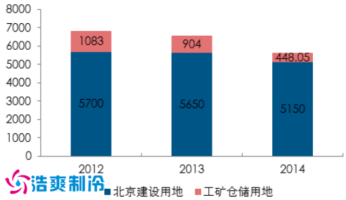 全國建設用地中工礦倉儲用地占比持續減少,2015 年比例為負,這一特點在大型城市更加突出。以北京為例,北京市國有建設用地供應計劃總量在近 3 年年的數量分別為 5700 萬平米、5650 萬平米以及 5150 萬平米,而其中,工礦倉儲用地分別則為 1100 萬平米、900 萬平米以及 450 萬平米。也就是說,工礦倉儲用地供應量占比在三年間從 19%,下降到 16%,直至 2014 年的 8.7%。