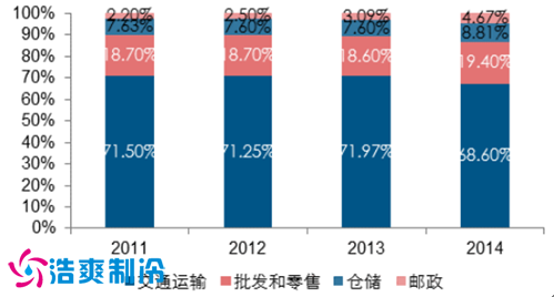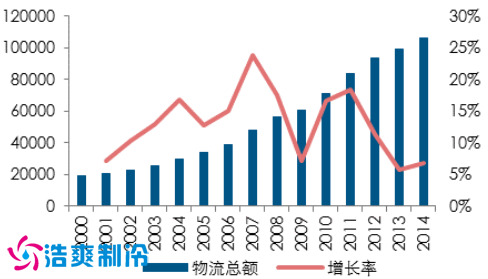 我國物流行業持續發展,2014年我國物流總費用可達到 10.6 萬億元,同比增長 7%。從物流業增長值的比例構成上看,盡管交通運輸在物流也得比例可達 70%左右, 但倉儲業占物流業年增長值的比例在不斷上升,2014 年可達到 8.81%。