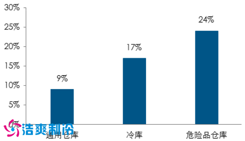 從倉庫種類來看,傳統倉儲業的倉庫類型是以通用倉庫為主, , 占倉儲總面積的 97% 以上。通用倉庫通常儲存沒有特殊存放要求的貨物,例如家電、服裝和快速消費品等,但是通用倉儲的平均利潤只有 9%; 冷庫和危險品倉儲等倉庫所占的比例分別大約為 1.3%和 0.8%。雖然冷庫和危險品倉儲平均利潤率可以達到 20%左右,但是對技術和人員的要求也很高,進入壁壘較高。
