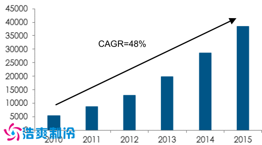 從 2010 年至 2015 年,我國在線零售總額年復合增長率為 48%,2015 年實現 28251億元的規模。同時,我國在線零售占到社會零售的比例也越來越高,從 2010 年到 2015年,上升了 9.2 個百分點。