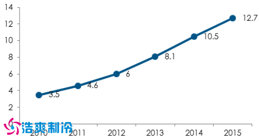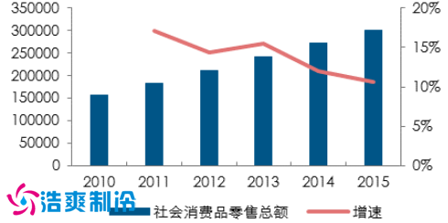2015 年底,我國第三產業對 GDP 的貢獻達到 66.4% ,對 GDP 的拉動率在 4.6% 。相比工業增加值(VAI) ,我國消費總額具有明顯的增長優勢,2015 年我國社會消費品累計總額已達到 200930 億人民幣。據預測,到 2020 年,全球消費品行業的市場規模將高達 7000 億美元,其中近五成將來自亞太地區,尤其是中國、印度尼西亞、印度、新加坡和泰國市場;僅就中國市場而言,其消費品行業的市場規模預計將增長約 2千億美元,占整個亞太市場增長的 60%。