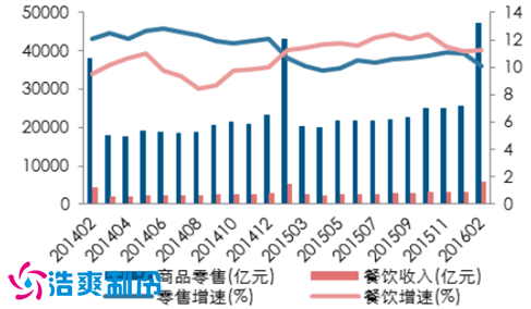 零售消費品主要分兩個部分,消費收入和餐飲收入。其中,商品收入占比較高但增長具有季節性,尤其在春節時期達到高值。相比較而言餐飲收入相對穩定,常年增速保持在 11%左右。