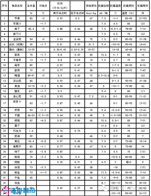 以下為食品冷藏保鮮溫度參數表(僅供參考)